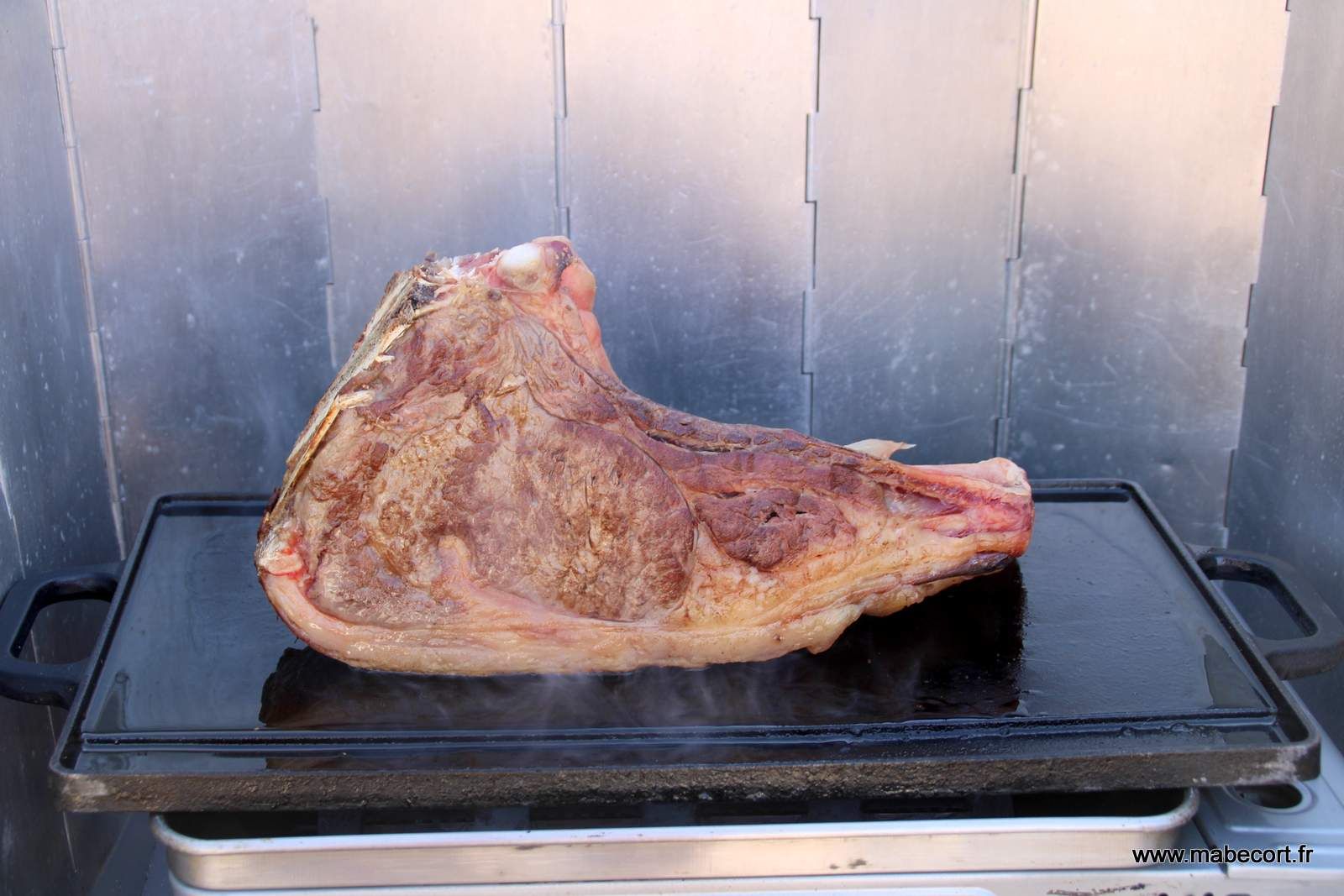 A la fin de la cuisson, pendant que Marie rentre le plat avec "la bête", je retire la plancha, encore bien chaude, du grill pour faire couler la graisse fondue. Manque de change la plancha bascule et la moitié de la graisse presque bouillante me tombe sur le pied. Aïe aïe aïe, ça brule un peu. Résultat, un beau tatouage.