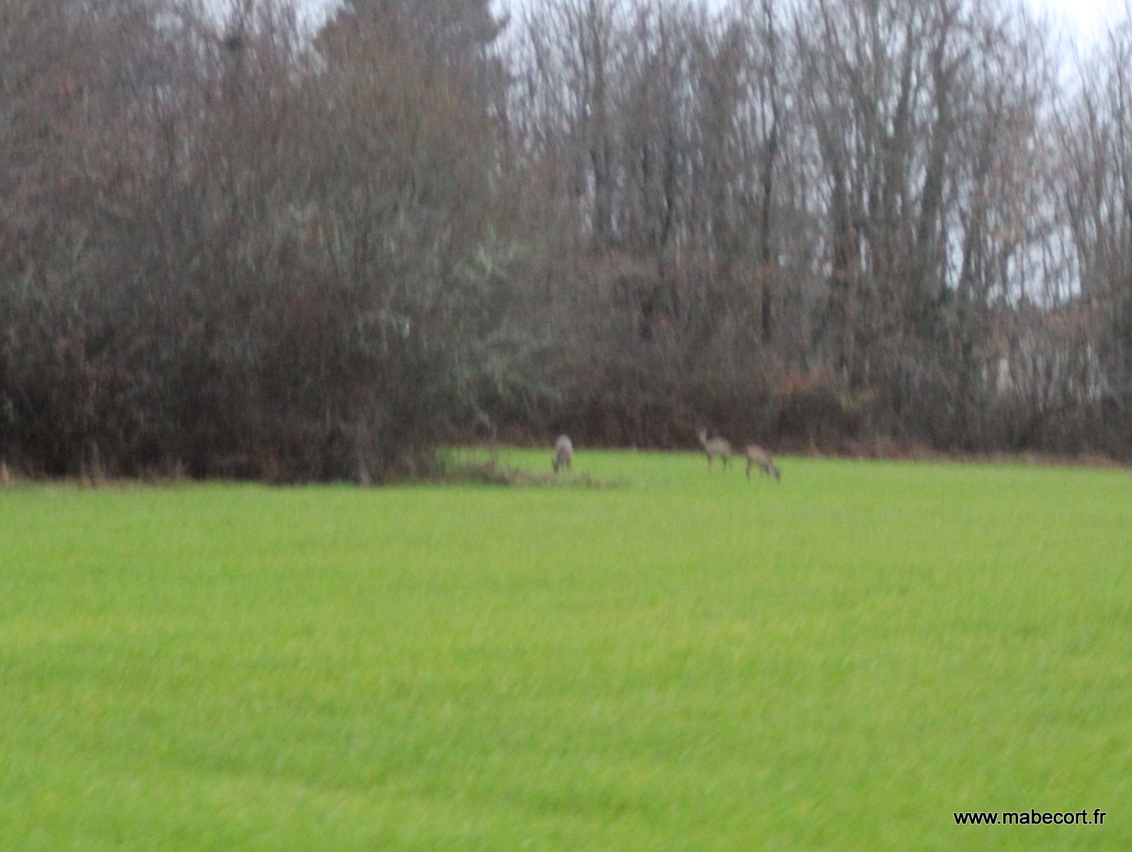 Lundi 07 février. Une nuit pluvieuse et lorsque nous quittons le parking il tombe encore un petit crachin. Sur notre chemin Marie réussie à photographier des chevreuils, ce n'est pas très net, mais il fallait réagir rapidement.