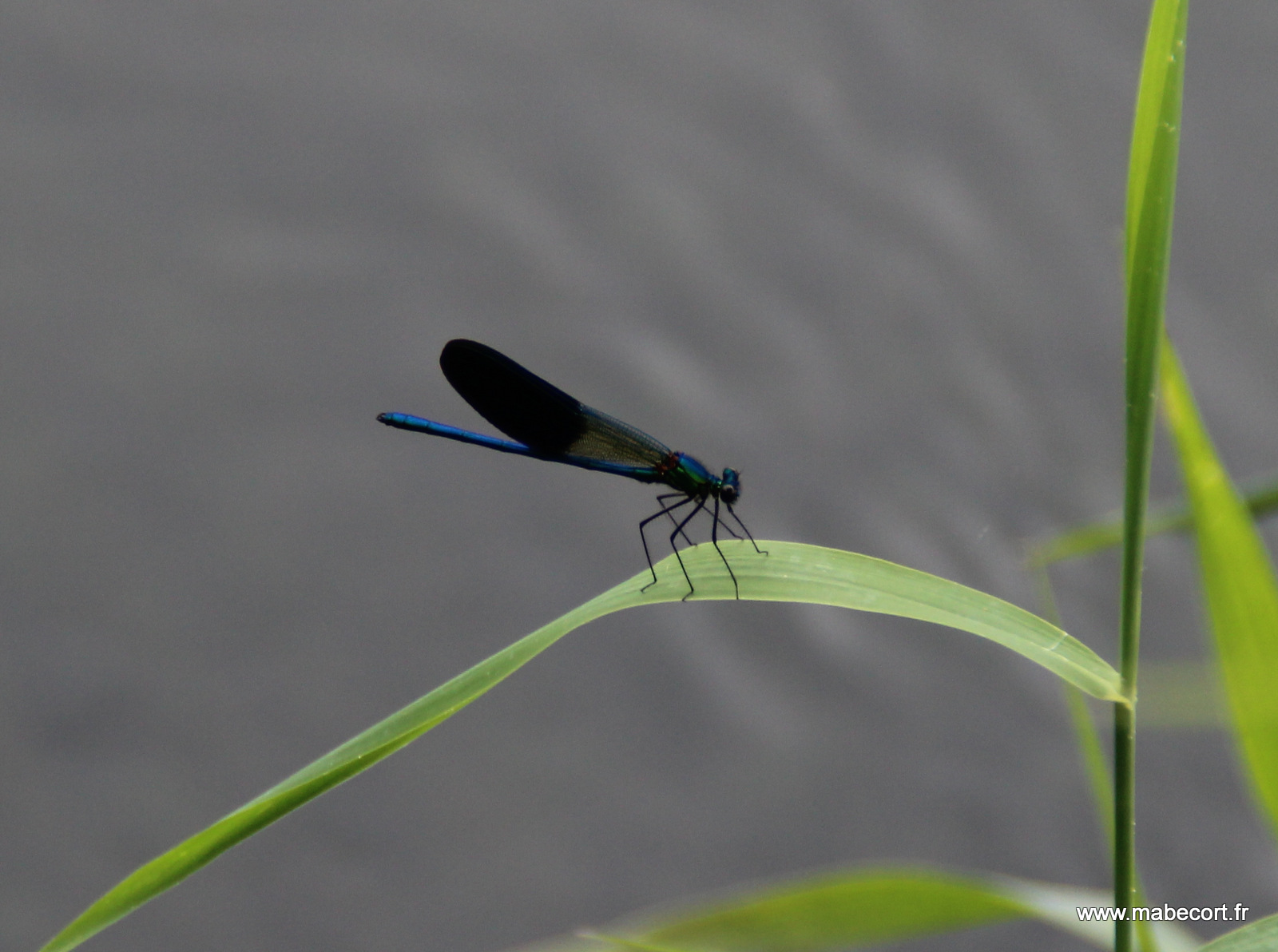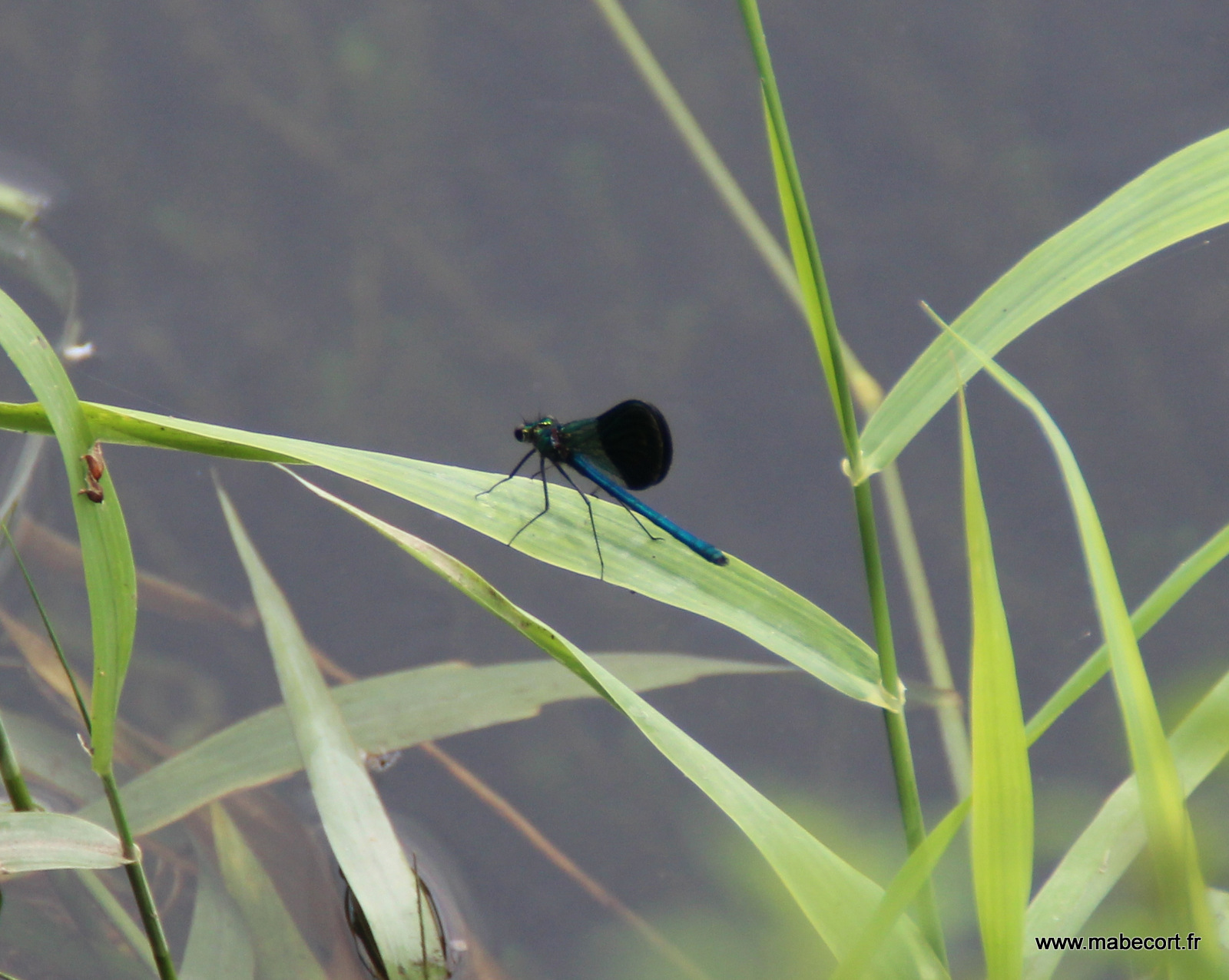 En revenant au CC par les bords de la Garonne, sur une herbe au dessus de l'eau, une libellule d'un très joli bleu, c'est une Calopteryx splendens.