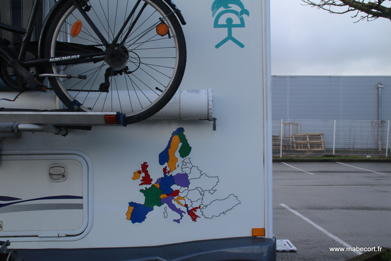 Tant que nous étions sur le parking à Anglet, je me suis amusé à coller la carte d'Europe sur l'arrière du CC. Au fur et à mesure que nous visiterons des pays je mettrais un sticker de couleur sur celui-ci.